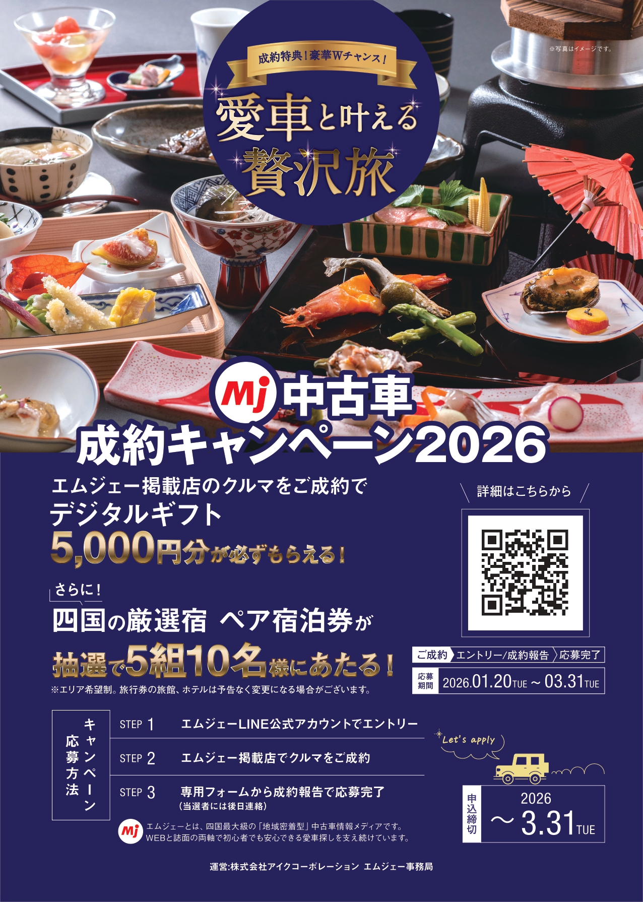 さらにダブルチャンスとして四国の厳選宿「ペア宿泊券」が抽選で5組10名様に当たります。おトクなこの機会にぜひMjでぴったりの一台を見つけてみませんか?